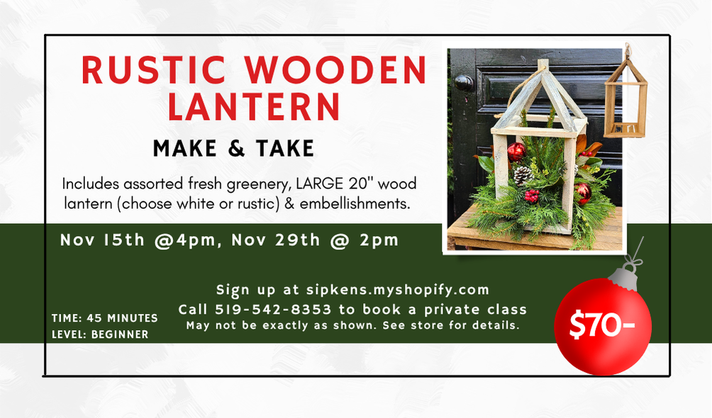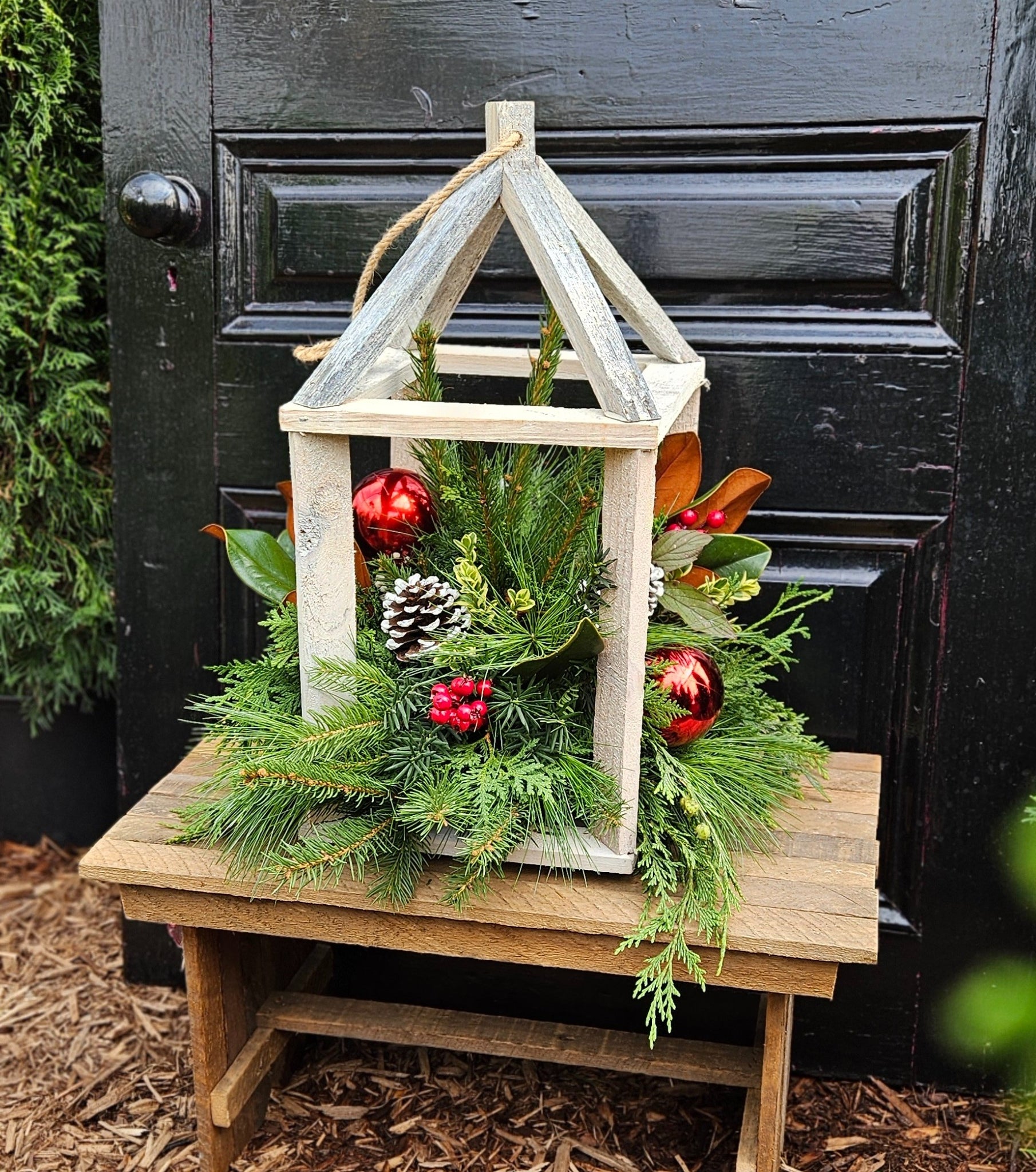 Includes: assorted fresh greenery, LARGE 20" wood lantern (white or rustic), & embellishments